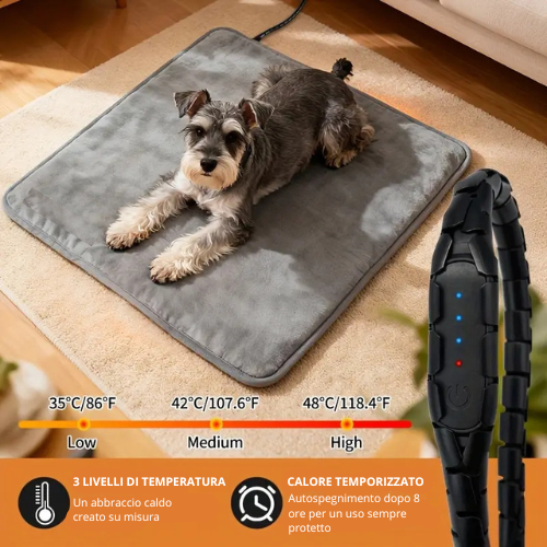 Questo tappetino riscaldato nasce per offrirgli un rifugio morbido, dove la temperatura perfetta e il massimo comfort lo accompagnano in ogni riposo. È ideale per le giornate fredde, per i piccoli di casa ancora delicati o per quelli più anziani che necessitano di un’attenzione in più.
